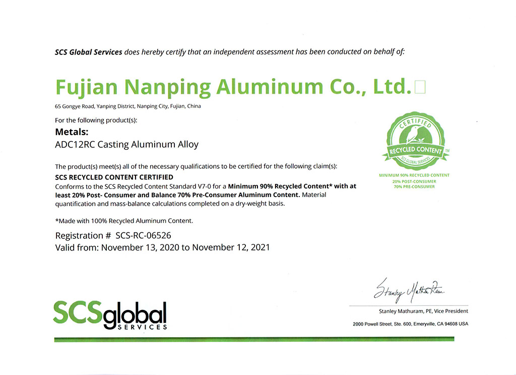 SCS回收成分認證證書