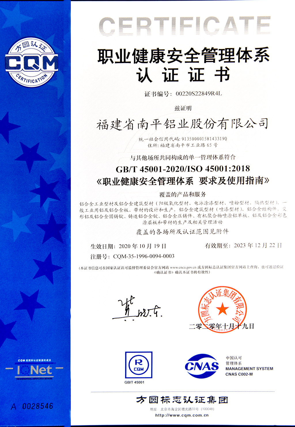 職業(yè)健康安全管理體系認證證書